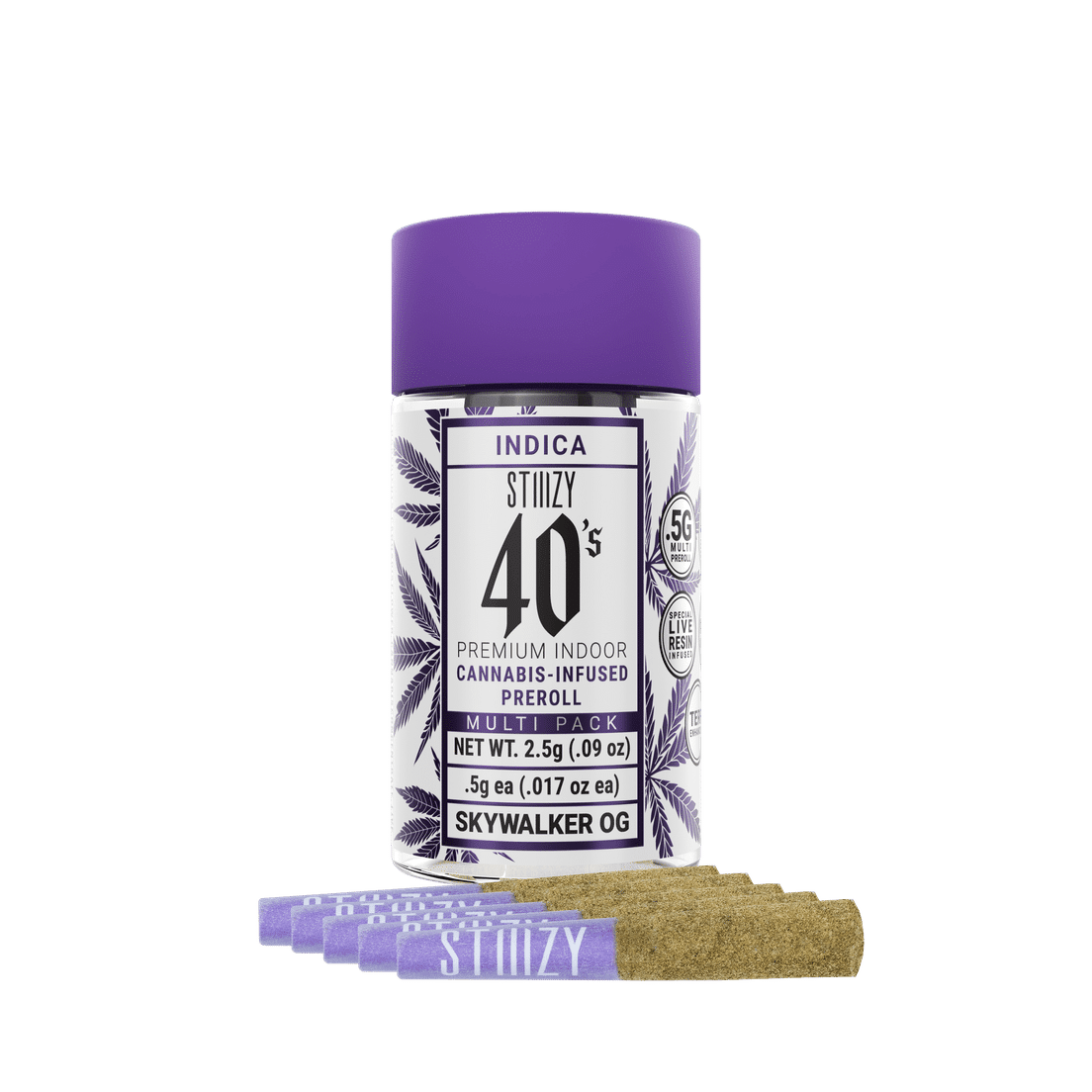 Elevate your preroll game with STIIIZY 40’s infused prerolls. STIIIZY 40’s start with .5 grams of our premium cannabis flower. Then we infuse that flower with our finest live resin and pack all that fire in a kief dusted cone. We name them 40’s to emphasize their standout potency, with each infused pre-roll consistently showcasing a rich cannabinoid profile. But STIIIZY 40’s are about so much more than just potency. Smooth, flavorful, and slow burning, STIIIZY 40’s also set a new standard for quality in infused prerolls.